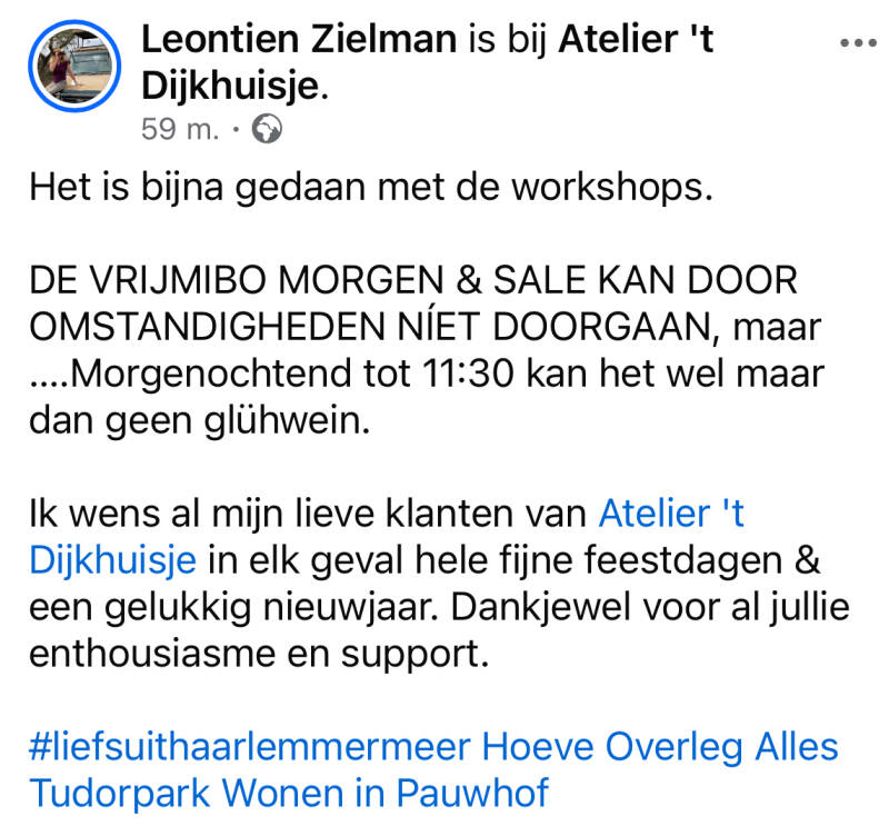 Voorbeelden van de workshops zijn onder vootbehoud; op = op maarrrr....als het ene op is komt er weer wat nieuws. Geen zorgen.